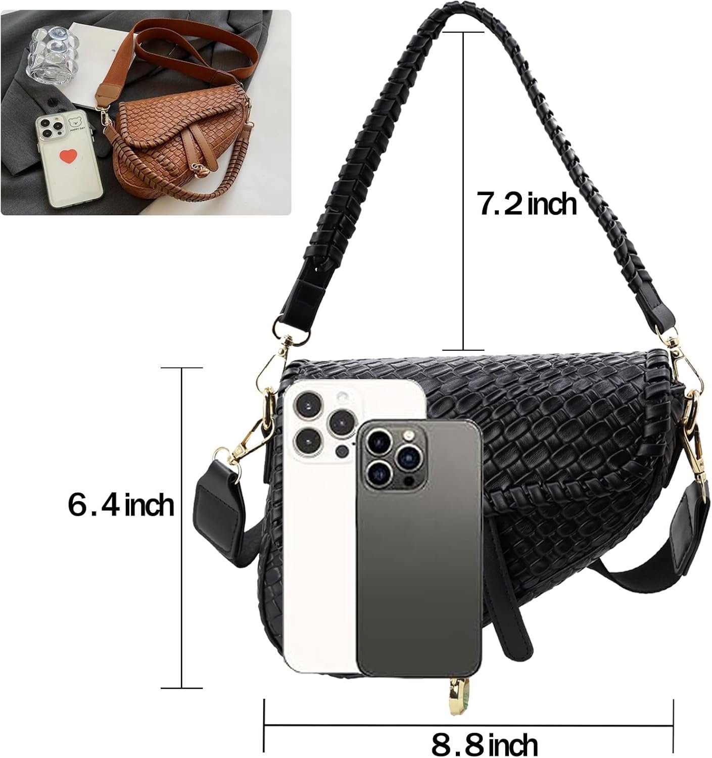 - Material and workmanship: Saddle bag made of high quality soft PU leather and non-genetic hand woven, this saddle bag has two shoulder straps, short strap folding :7.1 inches, long wide fold :18.1 inches, detachable bag size 8.2*6.6*2.7in